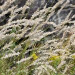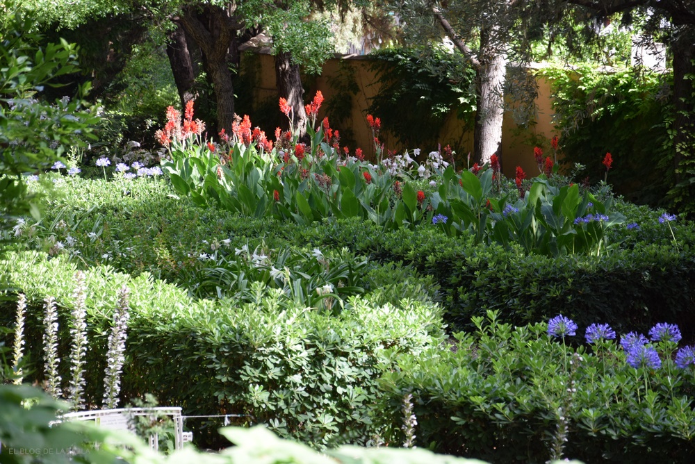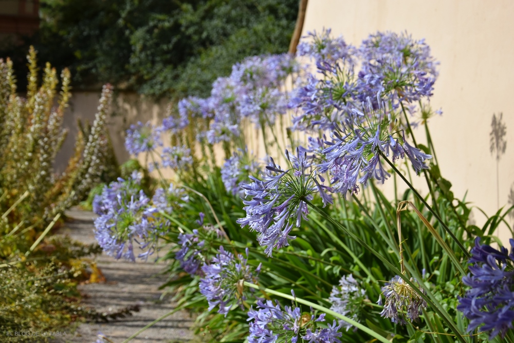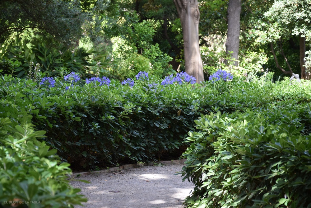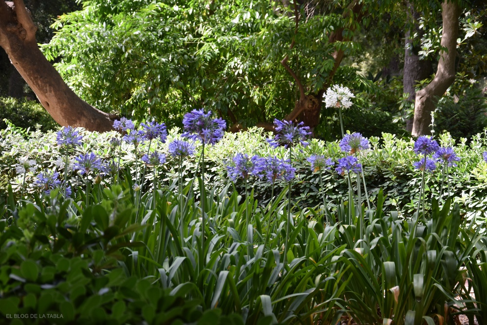 Hay una segunda zona, extensa y semiinformal, con elementos vegetales recortados y composiciones vegetales con formas libres de tradición paisajista. Esta zona comprende el parterre nuevo y la zona ampliada en 1971, con setos de evónimos marcando plantas que varían en función de la temporada. La pasada primavera, por ejemplo, se podían ver calas (Zantedeschia aethiopica) en masa, mientras que estos días de julio lo que he podido ver floreciendo son azucenas con flores de color blanco (creo que Lilium candidum) y agapantos (Agapanthus africanus).