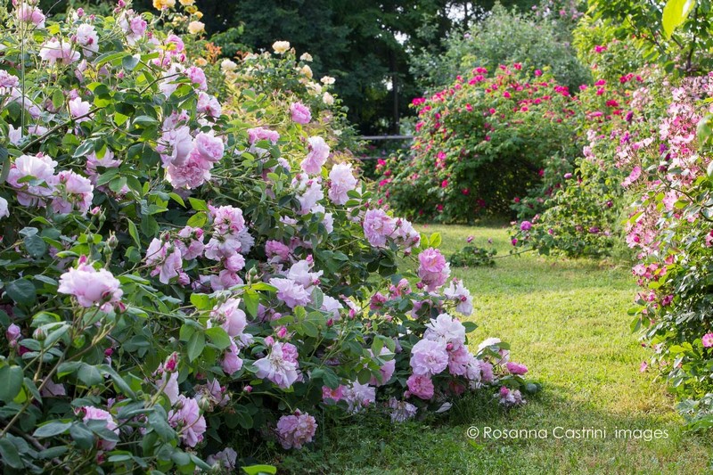 Rosa ‘Celsiana’ (izda.); Rosa ‘Ballerina’ (dcha.); al fondo: Rosa ‘Capitaine Williams’; al final, Rosa gallica ‘Splendens’