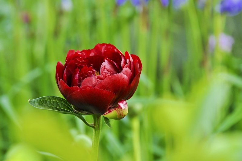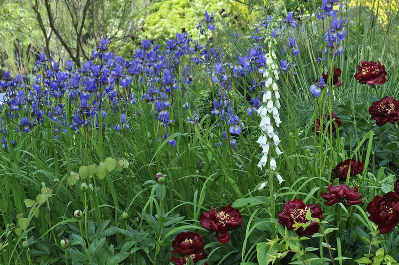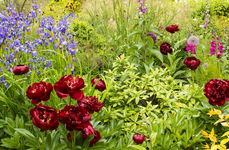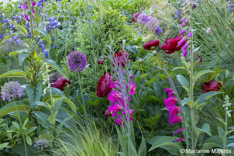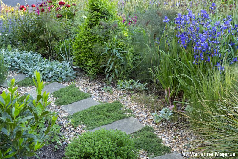 Alfombras de Tomillo (Thymus) y Stachys bizantina ‘Silver carpet’; creciendo en la grava Iris ‘Tropic Night’, Stipa gigantea, Digitalis purpurea, Gladiolus communis subsp. Byzantinus, y Paeonia ‘Buckeye Belle’.
