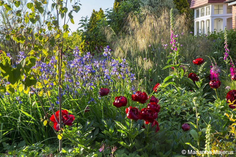 El jardín lo construyó en 2012, hace ahora seis años. Comenzó seleccionado plantas con gran estructura, utilizando el sistema de cuadrícula para la plantación. Los huecos que quedaban fueron rellenados después con gramíneas ornamentales, plantas vivaces y bulbos. La plantación se divide con un camino curvo, que se suaviza con piedra de York reciclada.