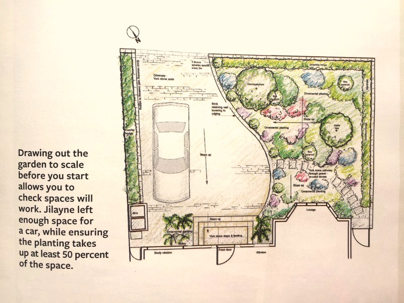 En este caso, el área que tiene frente a su casa mide 14 x 10 metros (un espacio algo más amplio que la media) y en pendiente hacia el pavimento. En su diseño, dejó espacio suficiente para el coche y se aseguró de dejar al menos un 50 por ciento del espacio para las plantas. El terreno en esa zona es muy arcilloso y se corrigió incorporando grandes cantidades de arena y estiércol de caballo antes de plantar.