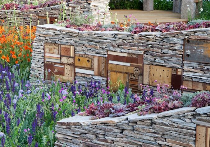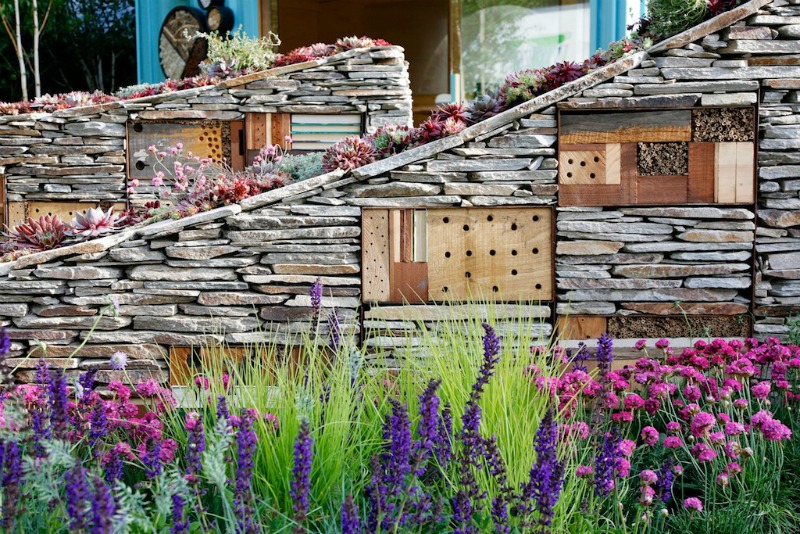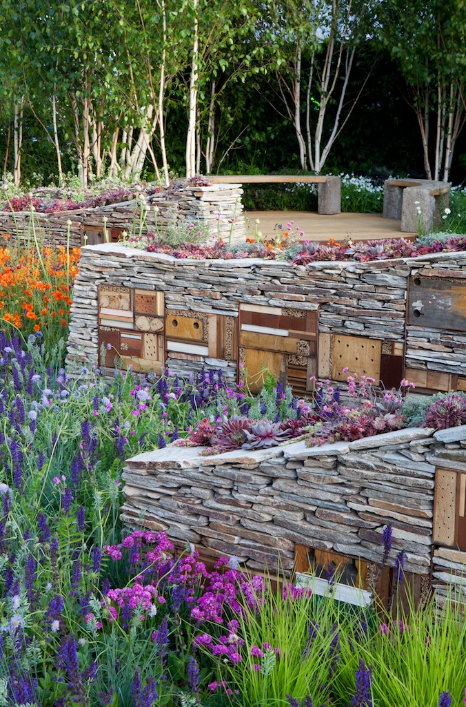 Las paredes se formaron con una estructura permanente de piedra seca, que se convierte en un perfecto hábitat para insectos beneficiosos y polinizadores.