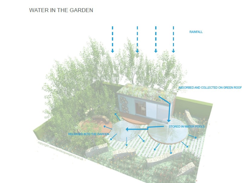 En el diseño, esta «segunda vida» del contenedor se desarrolla en el centro del jardín. Un jardín cuya base era crear una “cadena de agua de lluvia” que minimice los problemas de inundaciones cuando se producen tormentas de agua. Un recurso que también incluye en el diseño del jardín que presentará este año (ver aquí). Un jardín de lluvia absorbe agua como una esponja y la devuelve al lugar deseado en el momento idóneo