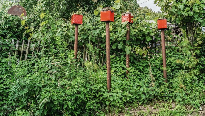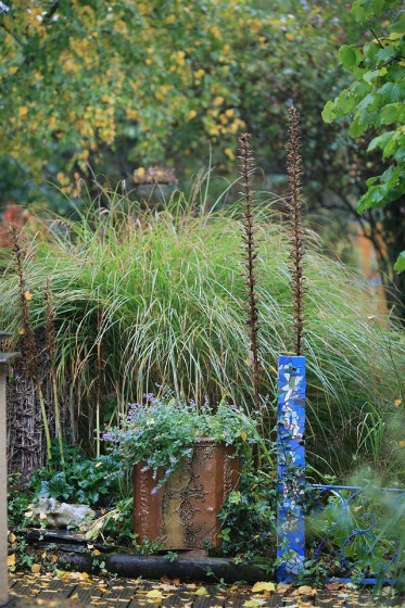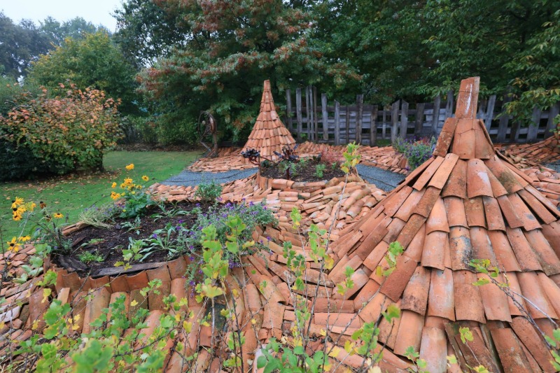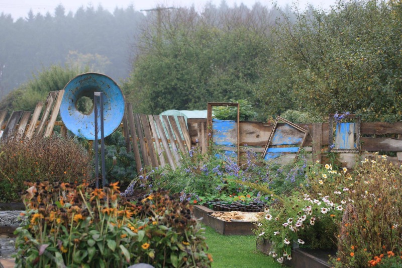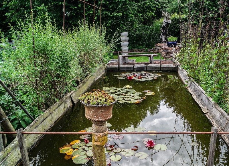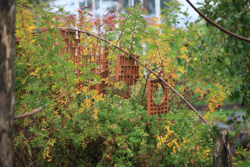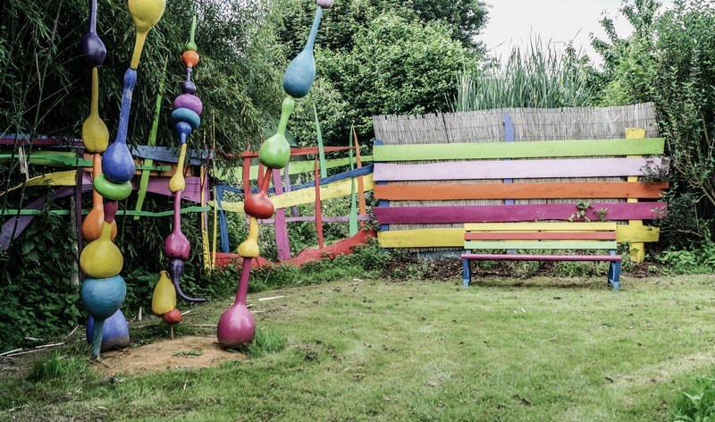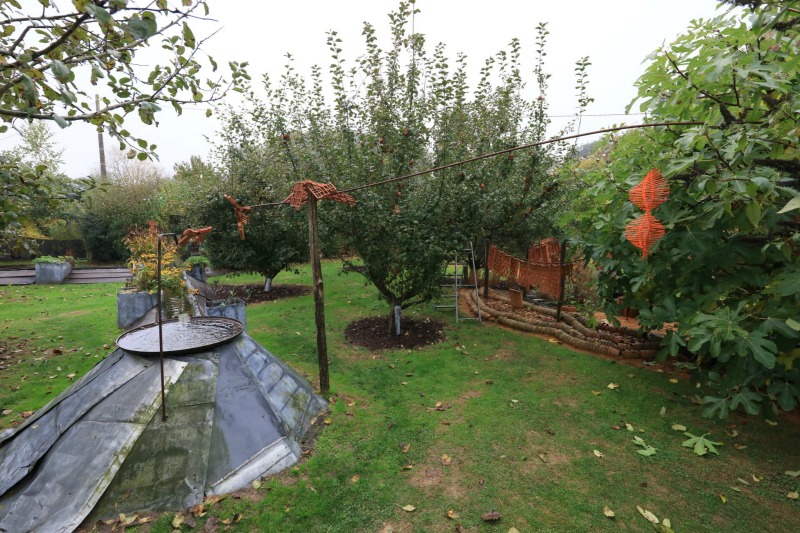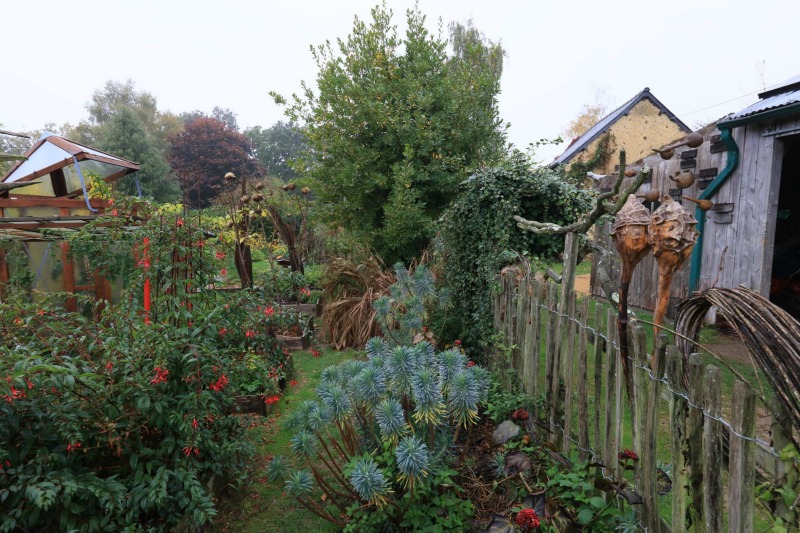 Esa actividad le llevó a crear un jardín que es todo un muestrario de elementos decorativos y útiles para el jardín, desde la recogida de agua de lluvia, hasta senderos y artilugios para atraer la fauna silvestre. Algunos parecen tener vida y sitúan al visitante en un mundo imaginario, un lugar de fábula que atrapa. Como es lógico, para los más pequeños, esa representación se convierte en un aliciente que les invita a quedarse allí más tiempo del que sus padres hubieran imaginado.