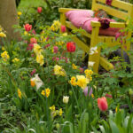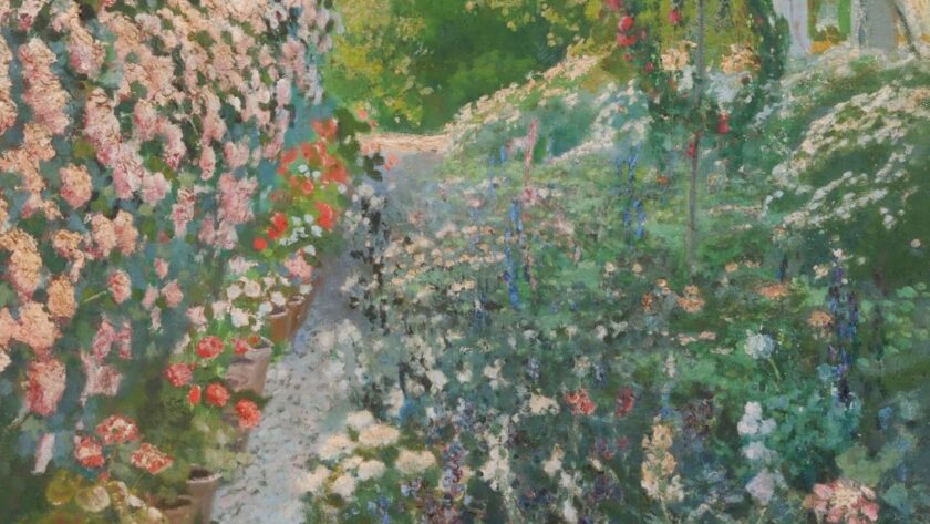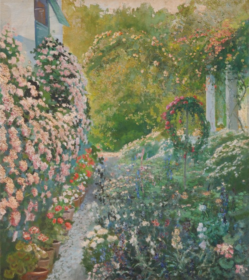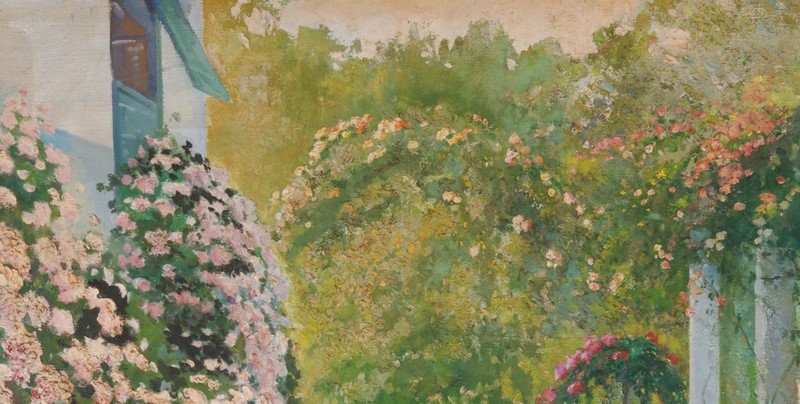 Pero ¿qué objetos son los que dan color? La obra recoge un ángulo del jardín del pintor en el que hay un complejo entramado de plantas, enredaderas, flores y macetas. En la parte lateral izquierda están los geranios trepadores (Pelargonium peltatum) sobre el muro blanco de la casa y delante de ellos macetas con otra especie de geranios (Pelargonium zonale). Enfrente, una pérgola sobre dos pilares sostiene un rosal. Desde el primer plano y hasta el fondo, se extienden una numerosa variedad de plantas y algunos árboles.