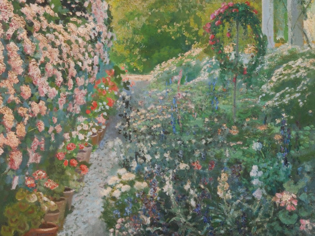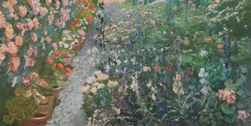 He buscado información sobre este jardín, pero no he obtenido ningún resultado. Tampoco encontré referencia alguna acerca de la posibilidad de que Abárzuza fuera aficionado a la jardinería, aunque todo apunta a que no era así. Lo que si deja ver es su admiración por lo que sus ojos contemplaban en ese jardín que, a juzgar por este cuadro, se trataba de un precioso jardín de flores.