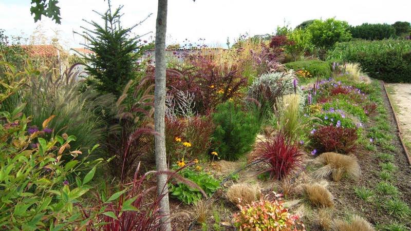Su idea fue hacer una base con Nandina domestica, Taxus baccatta y, en menor medida, Acer palmatum; Pino mugo, Nandina«firepower» y Berberisatropurpurea, entre otras especies. Esa base se enriqueció con gramíneas ornamentales y vivaces.