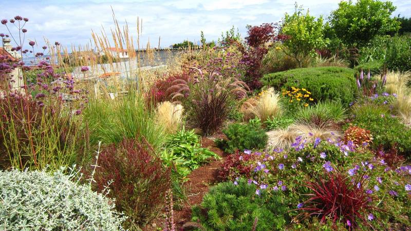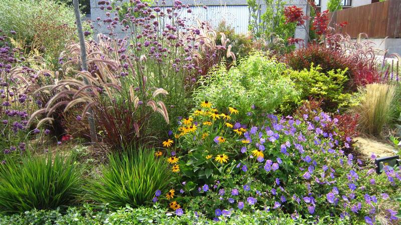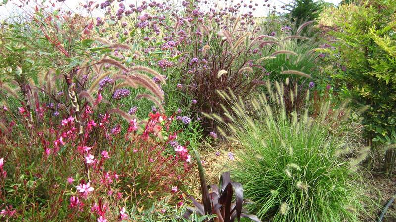 Geranium Rozanne y G. sanguineum, Verbena bonariensis y V. hastata, Persicaria amplexicaulis, Sanguisorba menziesii, Gaura lindheimerii, Lavanda stoechas, Romero, Aloisiatriphylla, Rudbeckia fulgida y Liatris spicata entre otras especies.