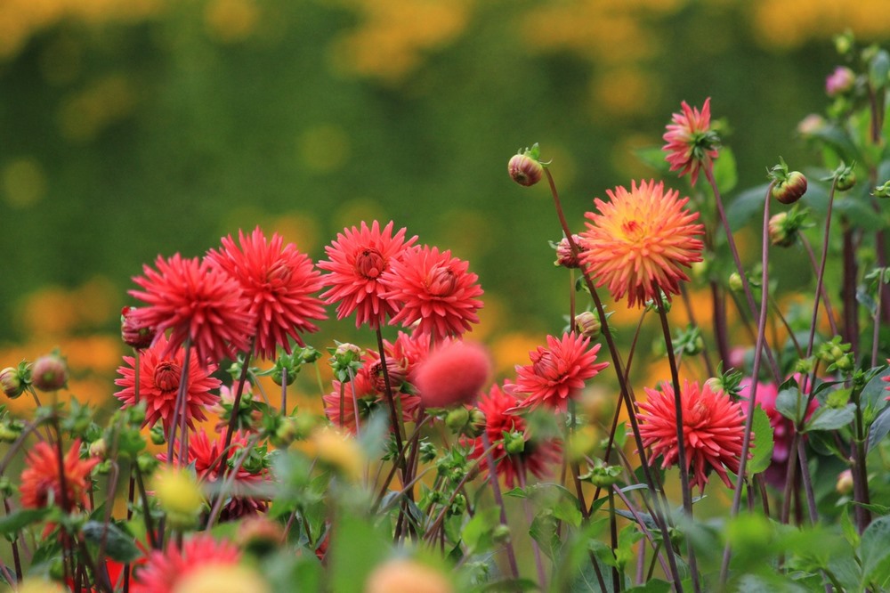 Junto a las dalias, también emergen esos días otras especies de plantas de flor, anuales y vivaces, entre las que se encuentran algunas variedades de Zinnia, Anemone japonica, Rudbeckia y Helenium.