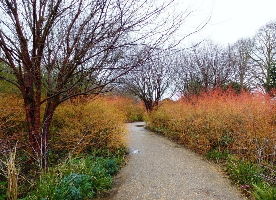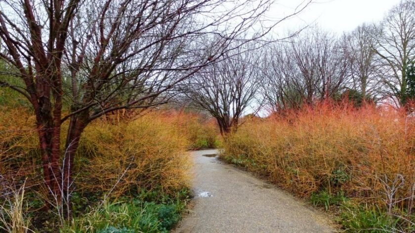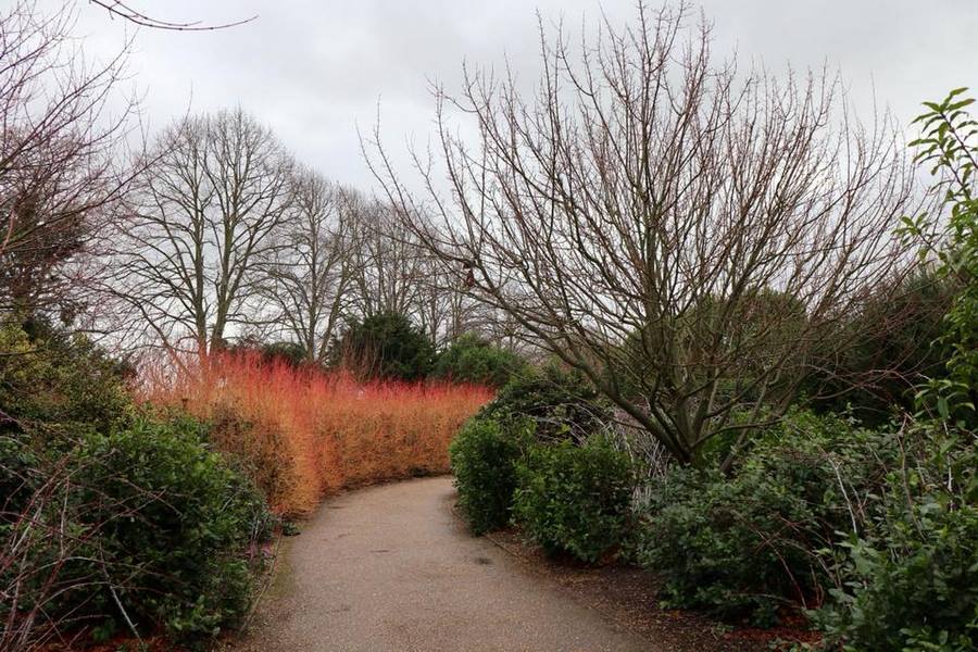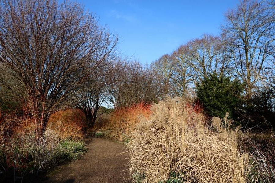 Los árboles han sido seleccionados especialmente para proporcionar colores vivos, texturas y un aroma increíble. Así, el paseo de invierno está salpicado por el rojo brillante de cornejos (Cornus sanguinea ‘Winter Beauty’), los vibrantes tonos naranja de algunas especies de sauces, como Salix alba var. vitellina recortada y la pulida corteza del tronco de cerezo tibetano (Prunus serrula).