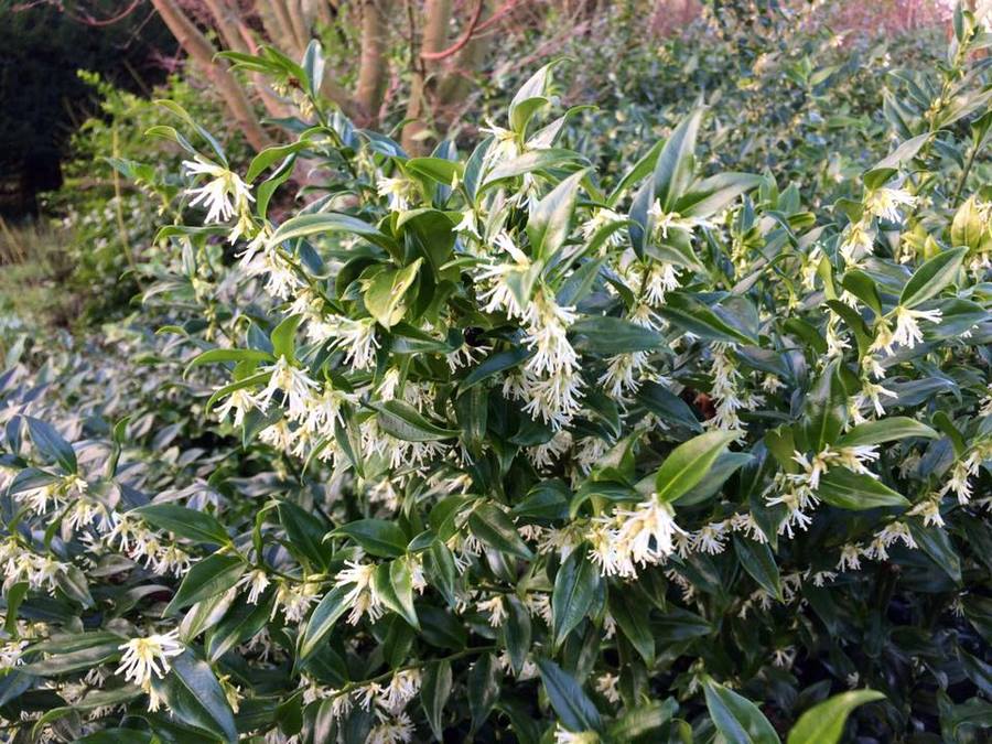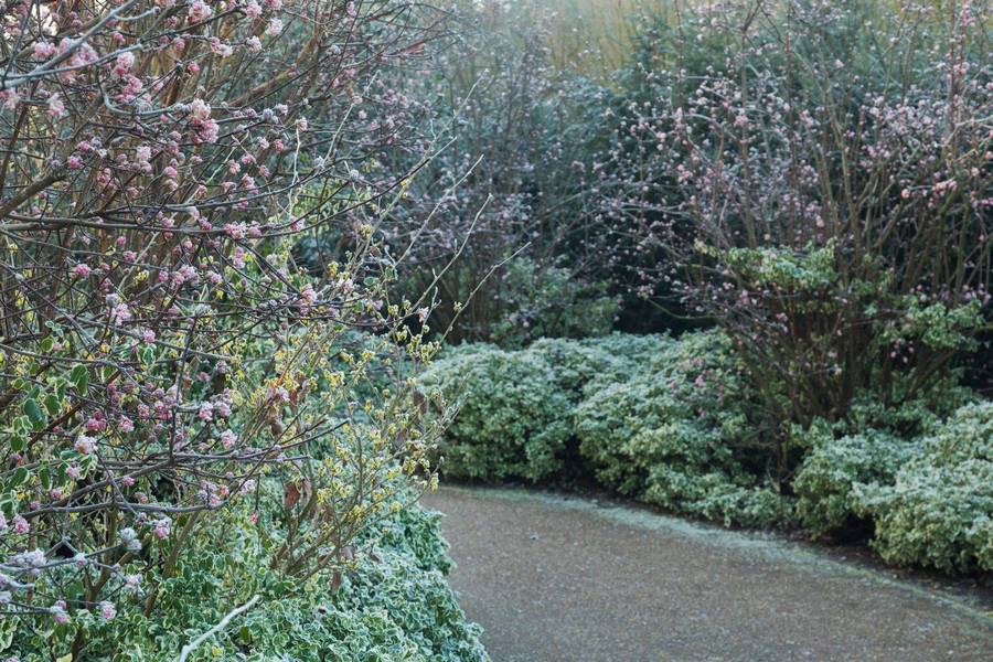 Las flores de Sarcococca hockheriana, Viburnumfarreri, Daphne bholua ‘Jacqueline Postill’, Chimonantus y Mahonia aportan belleza, pero sobre todo fragancia, mientras que en ese mismo paseo cubren el suelo plantas herbáceas como bergenias (Bergenia ‘Bressingham Ruby’) y vincas (Vinca minor).