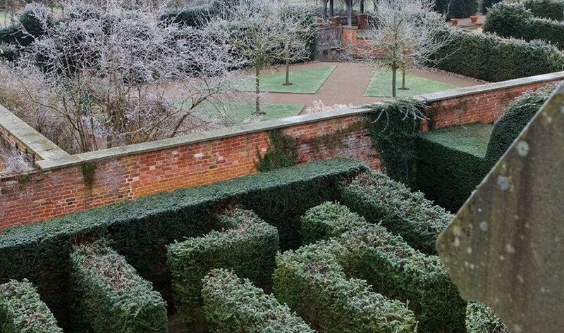 Cubiertas de escarcha, se muestran también cuatro de las diez pirámides altas, hechas a base de tejo (Taxus baccata) y recortadas con total precisión, que bordean un camino de césped y son la primera visión de los jardines de Wollerton Old Hall, situado en Shropshire.