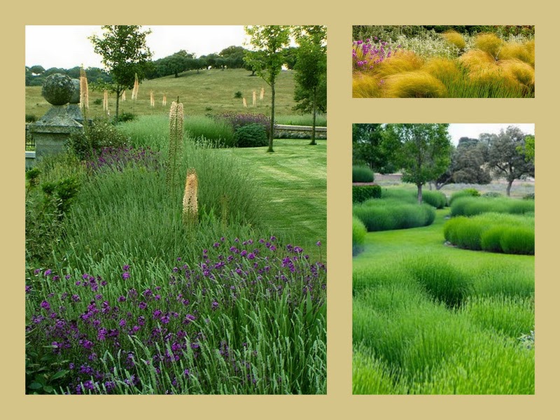 Buscaron especies a las que les gusta el suelo calcáreo y probaron con una mezcla mágica: Erisymum ‘Bowles Mauve’ (flor rosada) que utilizaban por primera vez; Euphorbia amigdaloides de flores amarillas y, entre otras especies de hoja gris como Teucrium, Helychrisum, Stachys, Perovskia, dos tipos de lavandas. Para dar movimiento la Stipa tenuissima que brilla acariciada por la luz del atardecer y el bello contraste rojo con Centranthus ruber.