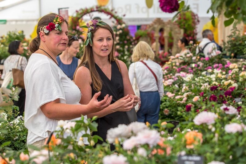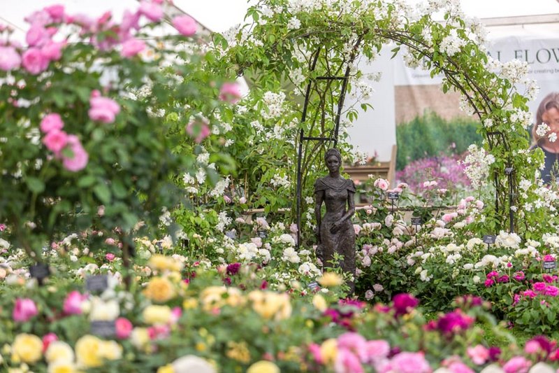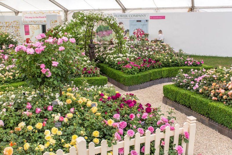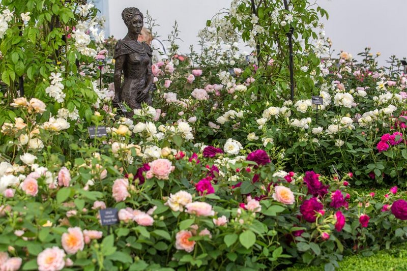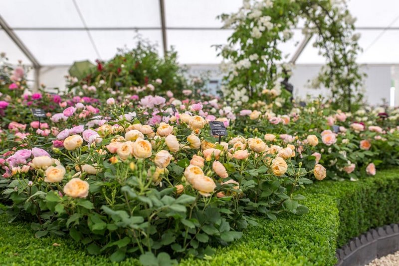 Una gran exhibición de Rosas Inglesas, excepto los arcos, que se han cubierto de rosales sarmentosos o lianas, conocidos como ramblers (Rambling Rose).
