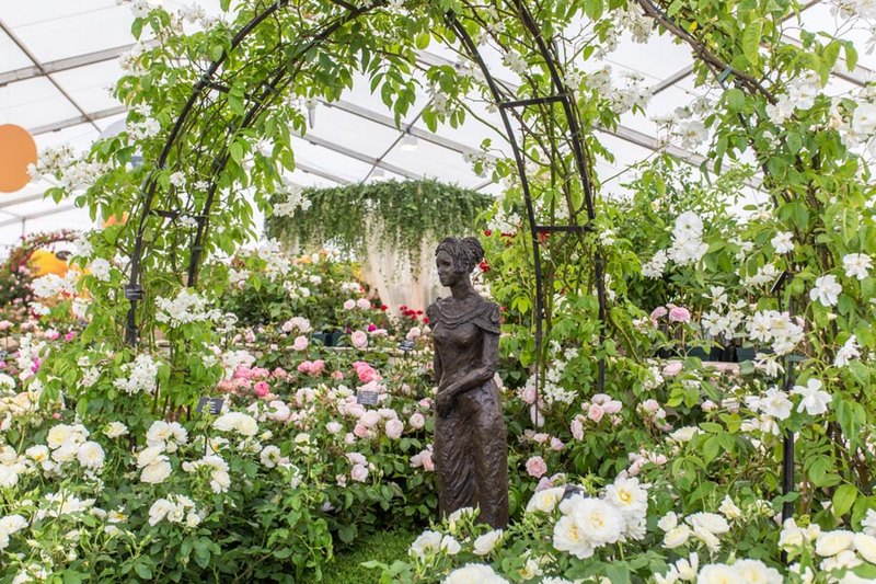Para la presentación del jardín de exhibición de este año, han instalado un cercado bajo que rodea todo el espacio. Además, hay una serie de caminos que permiten entrar en ese jardín y apreciar mejor las rosas inglesas, que se han dispuesto en cuatro camas. En diferentes puntos se aprecian arcos cubiertos con rosales ramblersy el punto focal lo proporciona la estatua de una mujer entronizada por un arco de rosas. Además, se ha creado un cenador bajo, a base de rosales ramblers, que cubre una zona de asientos. Allí nos sentaremos después, pero ahora vamos a ver alguna foto.