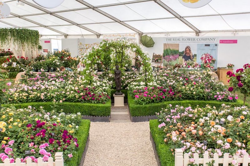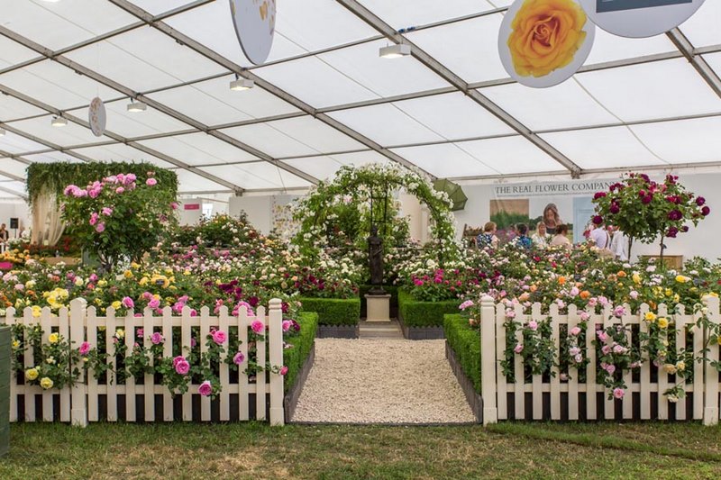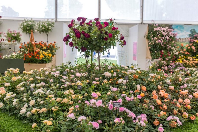 Este año el jardín de rosas de David Austin en Hampton Court Flower Show ha obtenido una medalla de oro (Best Rose Exhibit) , que se suma a las otras 15 medallas de oro conseguidas hasta la fecha. En esta ocasión se ha construido un espacio que representa un jardín de estilo patio.