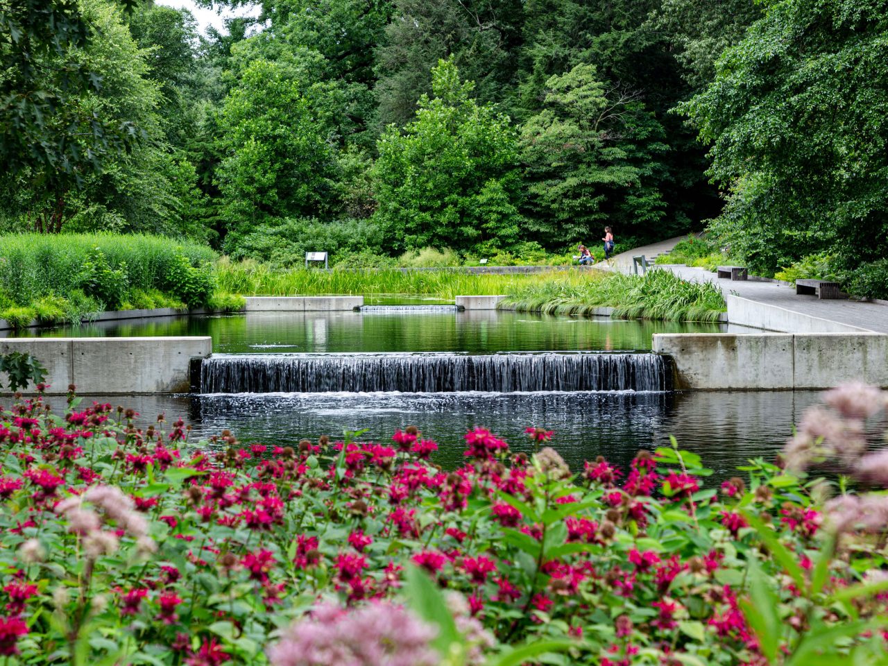 Cerca de 100,000 árboles nativos, arbustos, flores silvestres, helechos y gramíneas fueron plantados en un diseño contemporáneo cuidadosamente planificado que armoniza con el paisaje natural. Además, muchas de las plantas incluidas proporcionan refugio y sustento para la vida silvestre, haciendo de ese jardín un imán para ardillas, ranas y una colorida variedad de aves y mariposas.