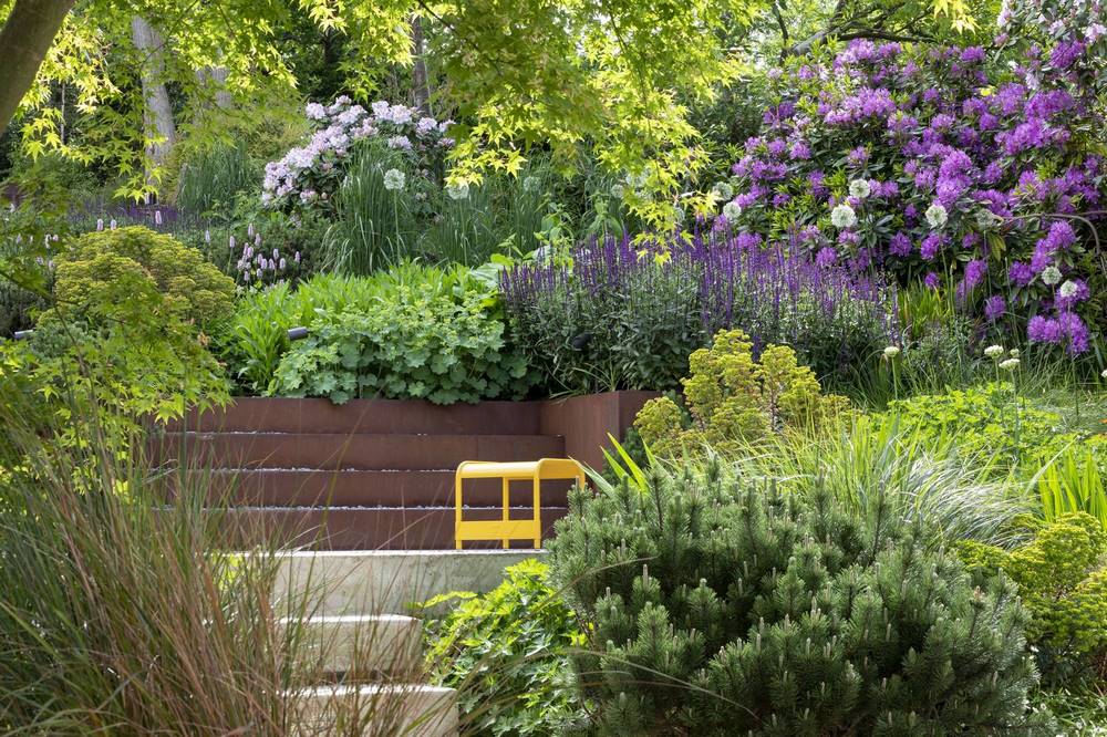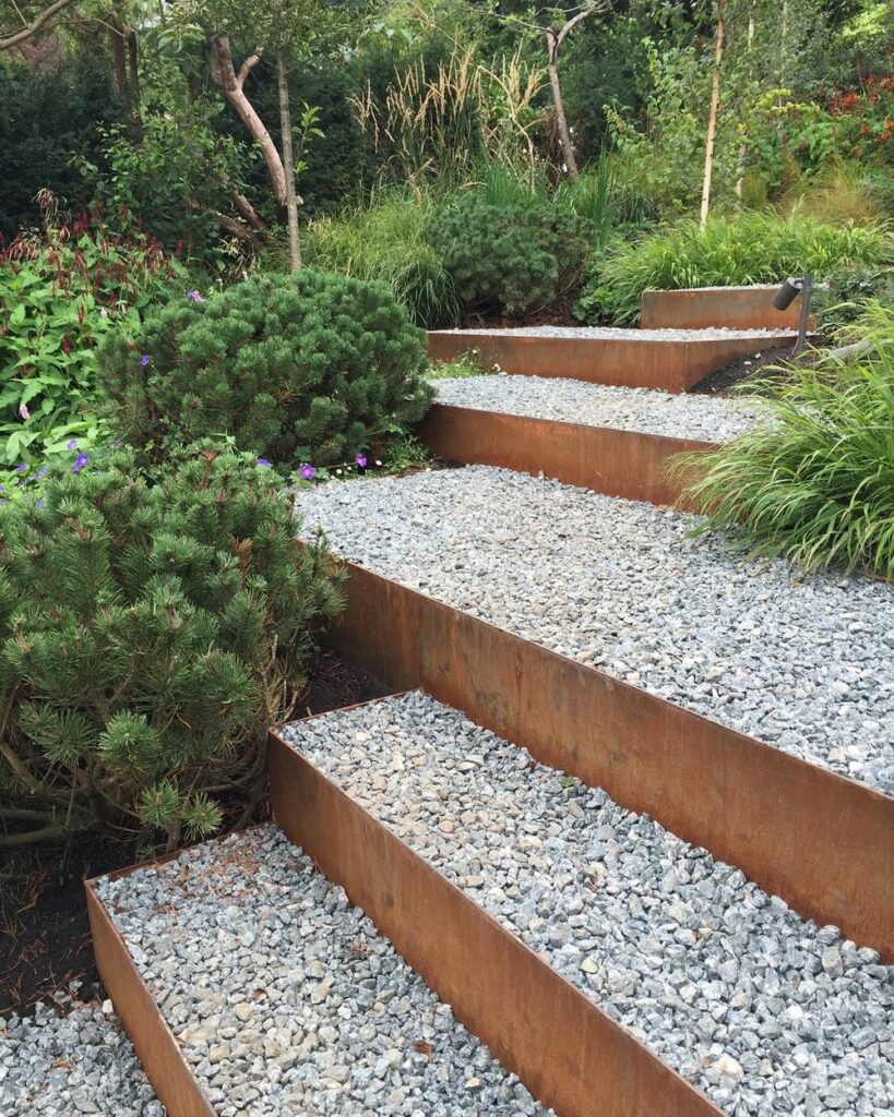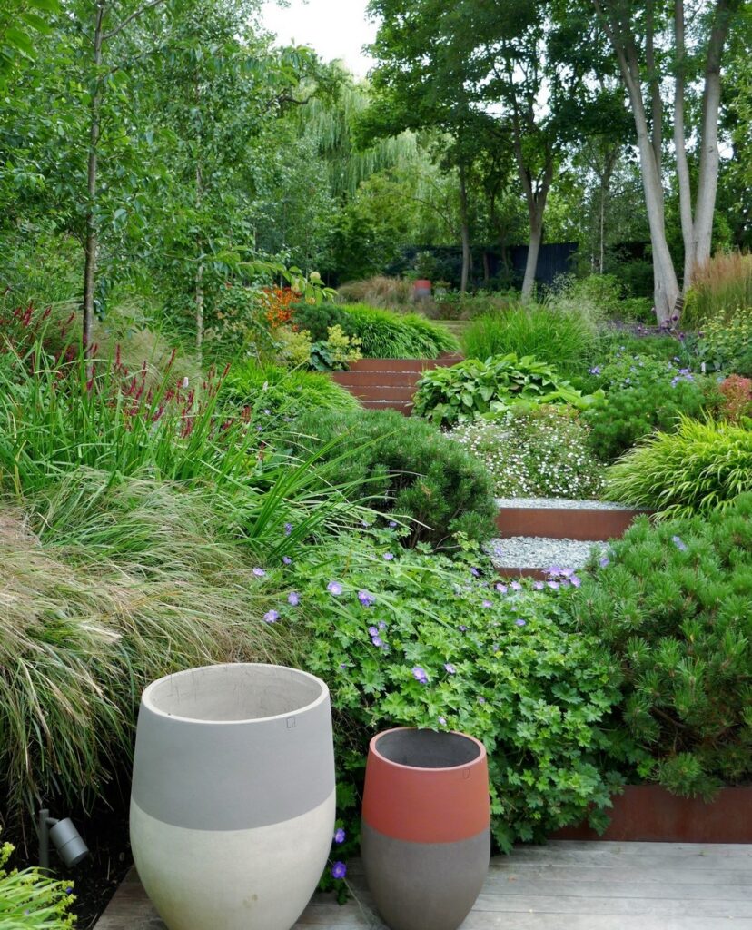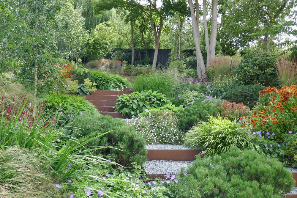 Los muros de contención de hormigón vertido in situ, la madera y los escalones de grava con bordes y contrahuellas de acero corten se adaptan a la intemperie de forma natural. Esto, combinado con el ritmo dúctil y ondulante y la repetición de la plantación, ha dado como resultado una composición muy relajante.