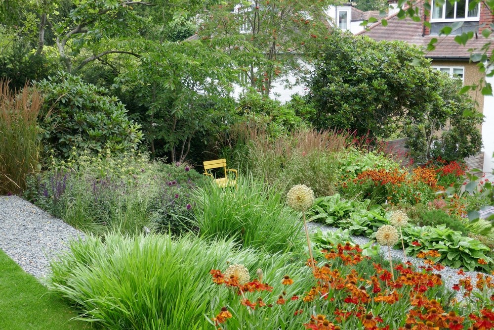 Una de las características en la plantación de este jardín de Muswell Hill es que el ritmo y la repetición marcan los bordes inclinados, envolviéndolo en una capa de verdes, púrpuras, rosas y azules.