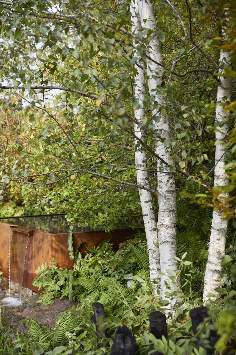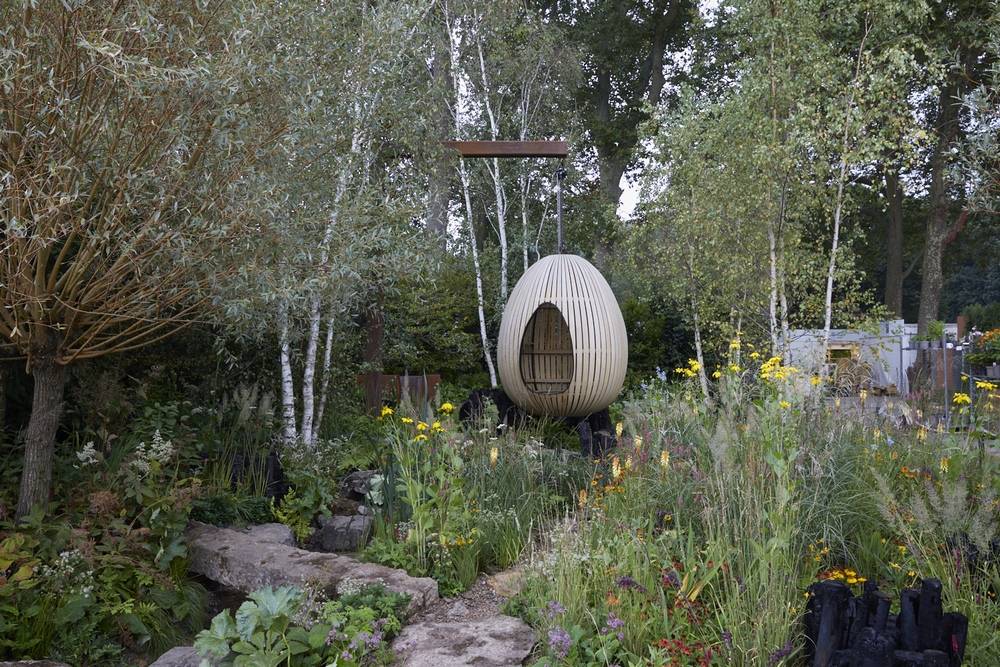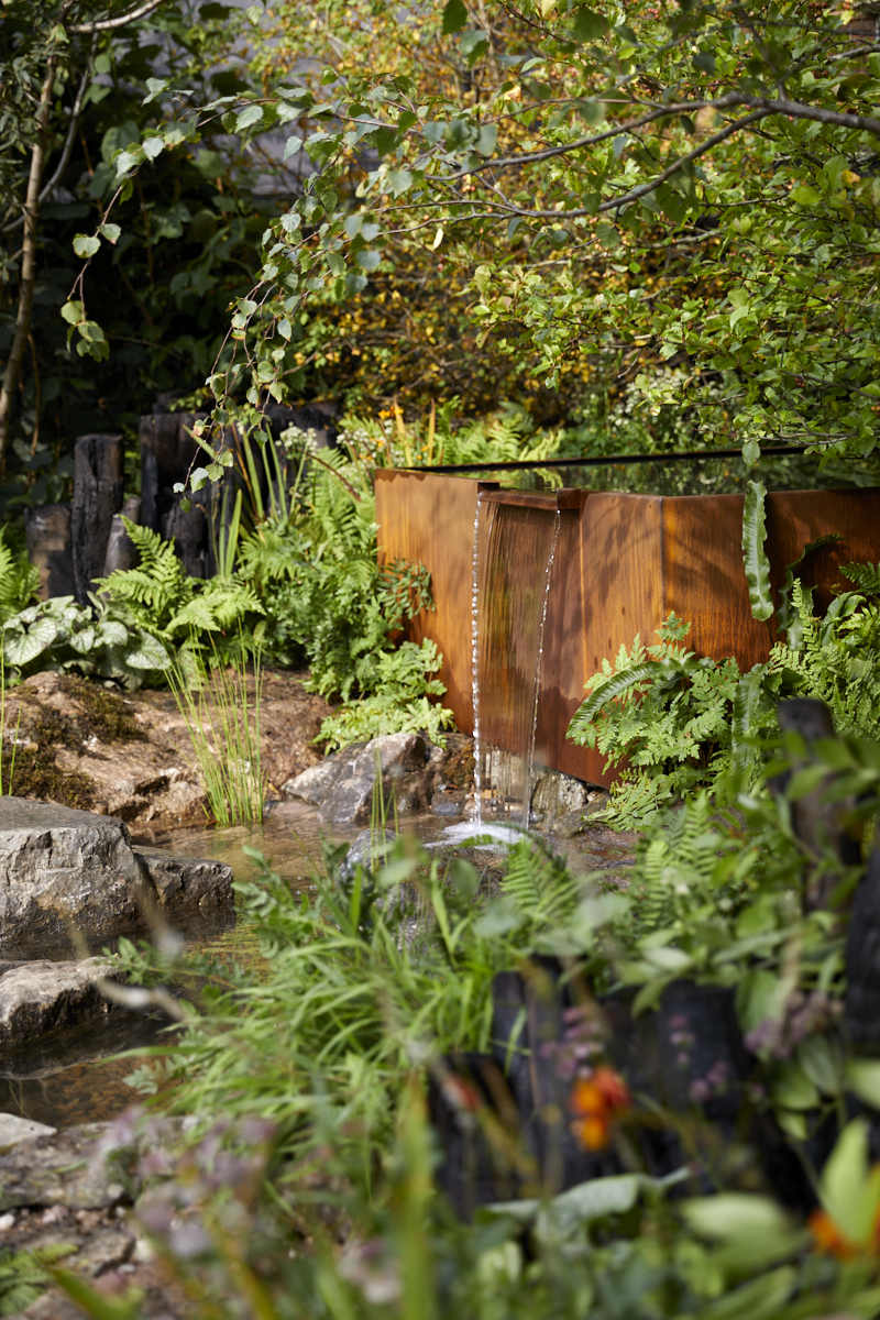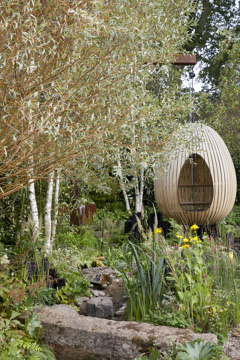 También hay una zona boscosa con árboles frutales y especies nativas como el abedul plateado, el avellano y el espino. Esta área representa tierras que podrían usarse para pastoreo en bosques.El arroyo, que se retuerce y gira a lo largo de todo el diseño, conecta los diferentes espacios del jardín y proporciona el relajante sonido del agua. Comienza en la cima de una suave colina que fluye de una simple charca reflectante de acero. Suspendido sobre esa corriente que fluye por todo el espacio se encuentra el principal punto focal estructural del jardín, un huevo de piel de roble doblada al vapor, hecho a mano en Cornualles por Tom Raffield, elemento que proporciona un lugar para relajarse, descansar y observar el entorno natural.