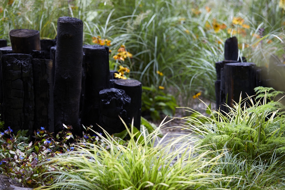 Todas las plantas seleccionadas para el jardín de exhibición en Chelsea Flower Show se han cultivado orgánicamente. En la parte delantera del jardín, un prado abierto de herbáceas perennes (vivaces) se llena con el color y el aroma de las flores. El espacio se divide con muros formados por tierra apisonada y troncos de biocarbón (biochar), un carbón vegetal que se obtiene de restos vegetales y residuos de biomasa y que, a diferencia del carbón vegetal clásico, no se quema, sino que se aplica al suelo para mejorar sus propiedades. Una representación visual de la salud del suelo y la importancia de fijar el carbono en él.