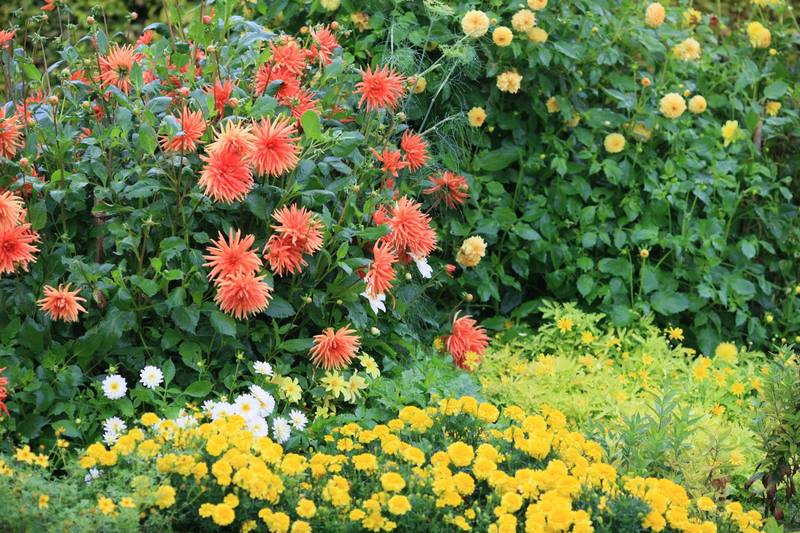Nenúfares, tulipanes, amapolas, capuchinas, glicinias, iris, rosas, peonías, agapantos, alliums, dalias y mucho más. Todas iluminan el jardín hasta que, al final de la temporada, en octubre, se levanta. Entonces viene la excavación y plantación de bulbos, tarea que se extiende hasta Navidad. En total, 25.000 bulbos cada otoño. Además, se plantan 100.000 plantas bienales y perennes, y 100.000 anuales. Mención especial merecen las 1.200 dalias, las reinas del jardín de finales del verano y otoño, que se plantan cada primavera.