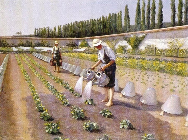 Existen numerosas pinturas inspiradas en la jardinería. Escenas donde aparecen jardineros o jardineras más o menos solitarios, herramientas de jardín, guantes y regaderas que son una joya.