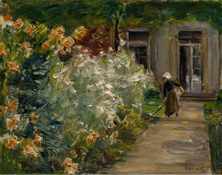 Gardener in front of the flower gardens at the gardener’s cottage to the east, ca. 1923-24 | Max Lieberman