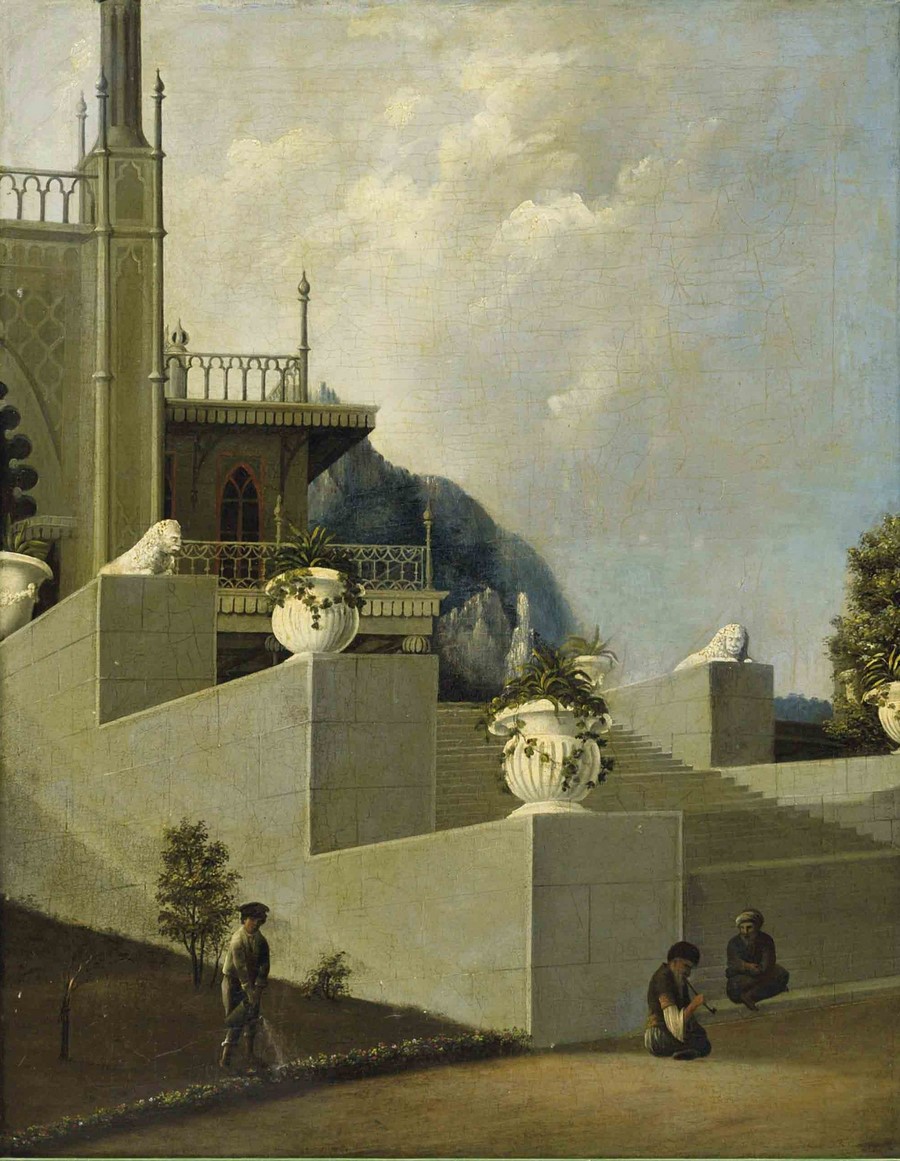 A Moorish palace, with a gardener and figures in the foreground | French School, Early 19th Century