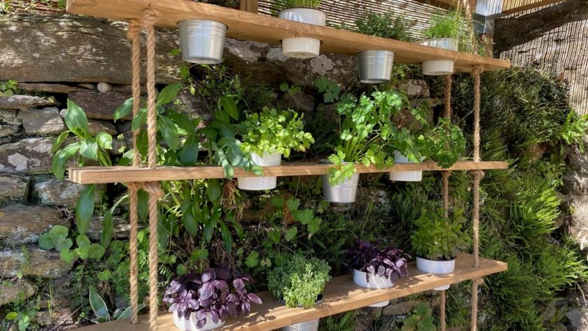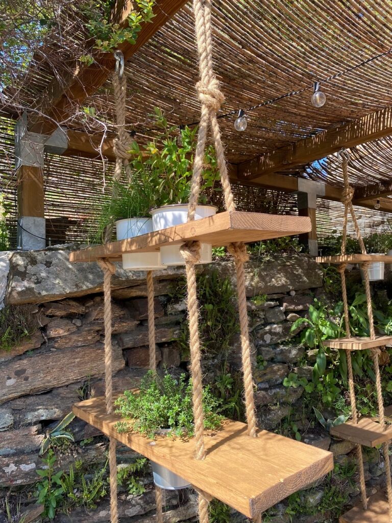Para todo tipo de plantas, pero especialmente útiles para cultivar hierbas aromáticas en pequeños espacios y tenerlas siempre a mano. Son jardines colgantes hechos con estantes de madera y cuerda, ideales para patios o terrazas, que tienen la ventaja de que pueden encargarse a medida.