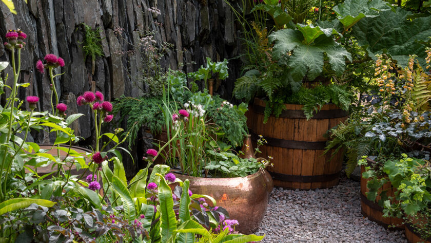 También se ha presentado un jardín en contenedores diseñado para prosperar en condiciones húmedas, influenciado por el follaje de los bosques húmedos del Reino Unido. Inspirado en un jardín lluvioso de Manchester, ‘The Enchanted Rain Garden’, diseñado por Bea Tann, cuenta con plantas robustas de color verde intenso, con texturas cerosas que brillan cuando están mojadas, así como helechos que retienen las gotas de lluvia en los espacios blandos entre sus hojas.