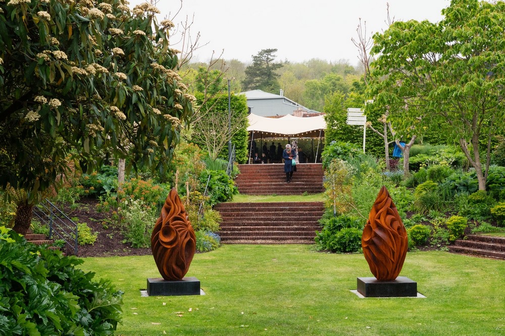 Las plantas que llenan estos jardines contrastan con el Figaro Garden, una zona tranquila y sencilla creada con setos de tejo y el estanque que rodea la escultura Draped Reclining Woman de Henry Moore.
