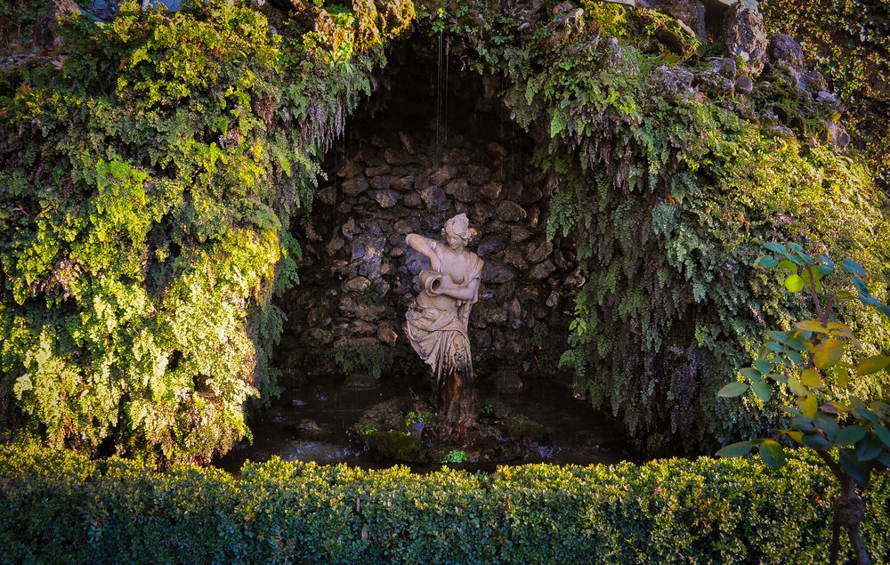 Entre el palacete y el lago romántico, el jardín francés ha perdido parte de sus estructuras, pero aún mantiene estanques, setos y esculturas de terracota entre palmeras, magnolios y arbustos de flor.