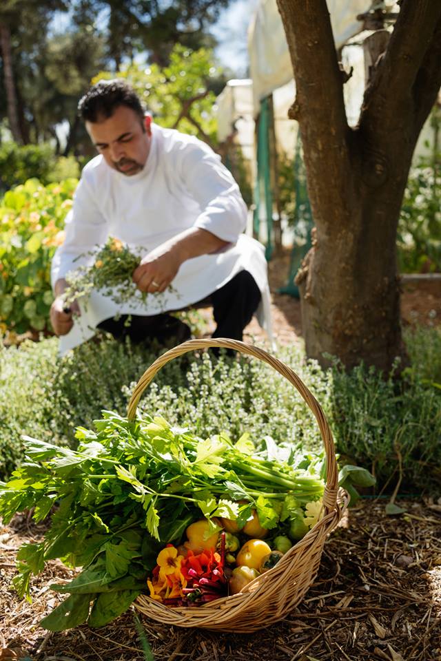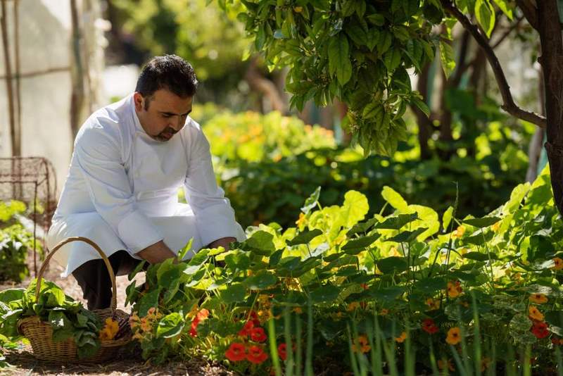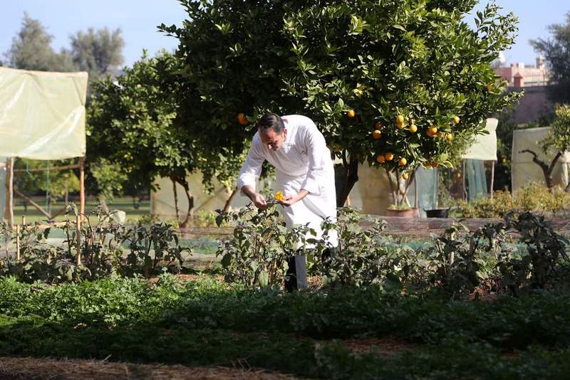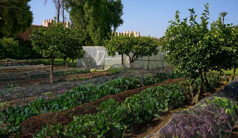 En el huerto se cultivan numerosos tipos de vegetales procedentes de diversos lugares del mundo y que, por supuesto, se utilizan en la cocina de los diferentes restaurantes del hotel. Hay, por ejemplo, 15 variedades de sabrosos tomates. No faltan especias y hierbas aromáticas, como el cilantro (Coriandrum sativum), la hierbaluisa o verbena de Indias (Aloysia citriodora), albahaca (Ocimum basilicum), orégano (Origanum vulgare), estragón (Artemisia dracunculus), limoncillo (Cymbopogon), violetas (Viola odorata), capuchinas (Tropaeolum majus), el toronjil de caña o limoncillo (Cymbopogon citratus) y la menta Borji (Mentha spicata var. Crispa) indispensable para preparar el té marroquí.