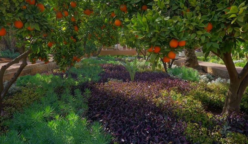 Tras pasear por los jardines, entre macizos de flores y bosquetes, encontraremos un camino bordeado a ambos lados con enormes y altísimos olivos centenarios —hasta 700 años— que nos llevarán a descubrir un magnífico huerto de 1.500 m2.