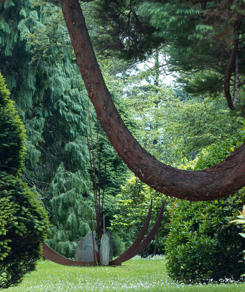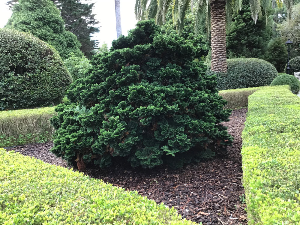 Uno de los árboles más bellos de la densa arboleda del jardín es el falso ciprés japonés (Chamaecyparis obtusa ‘Nana Gracilis’), de reducidas dimensiones –120 cm de altura– pero con más de setenta años de vida.