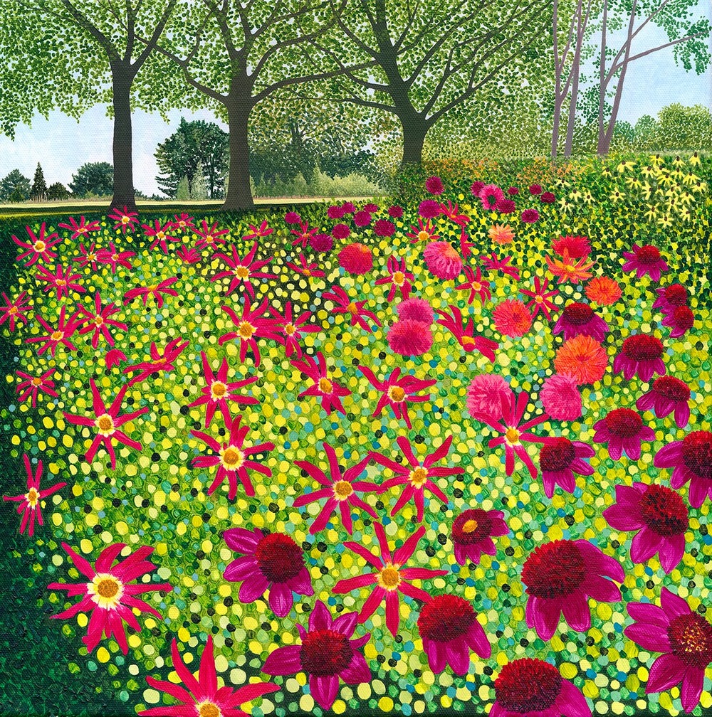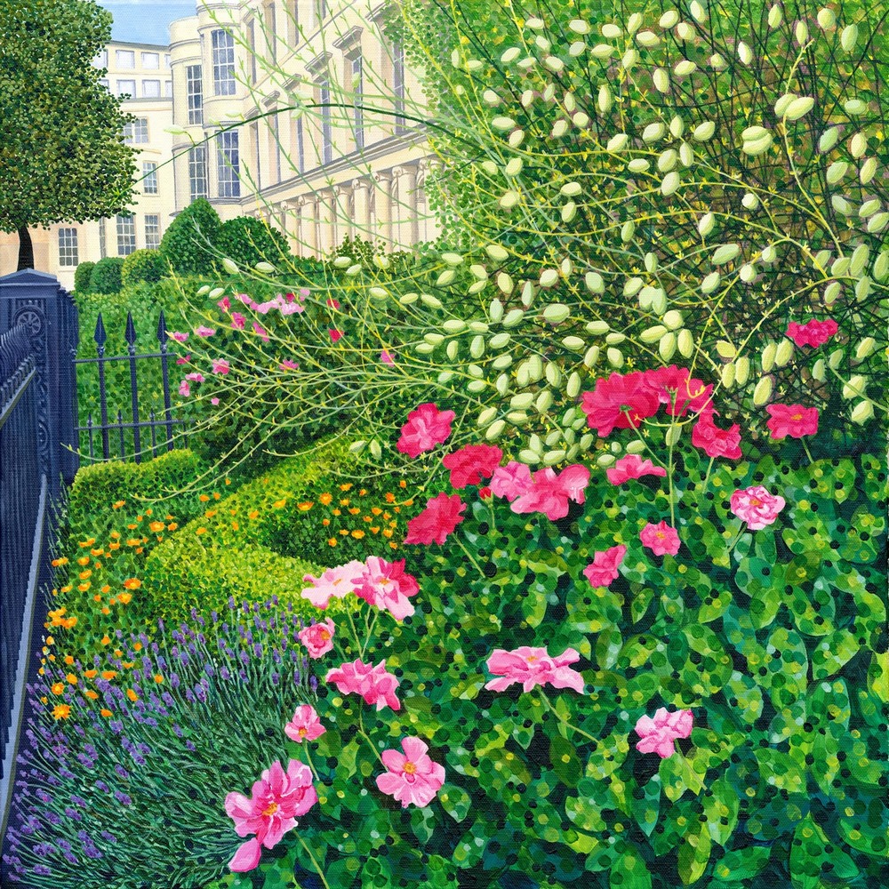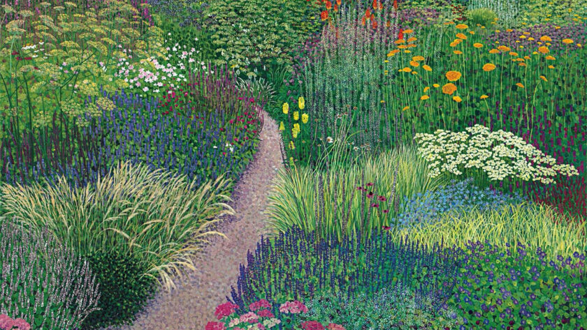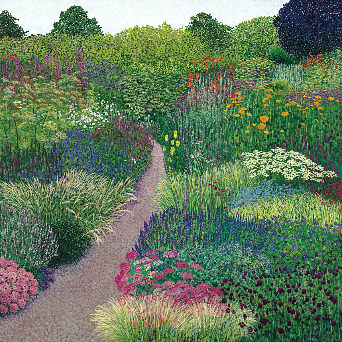 En Cambo Garden Fennel recoge un festín de flores y hierbas vistas en el jardín amurallado de Cambo Estate & Gardens, situado en la costa este de Escocia, en el condado de Fife. La propiedad actual data de finales del siglo XVIII y principios del XIX. Ver más en: Cambo Gardens, un jardín amurallado georgiano con plantación naturalista. Otra de sus pinturas en ese mismo jardín es Through The Garden.