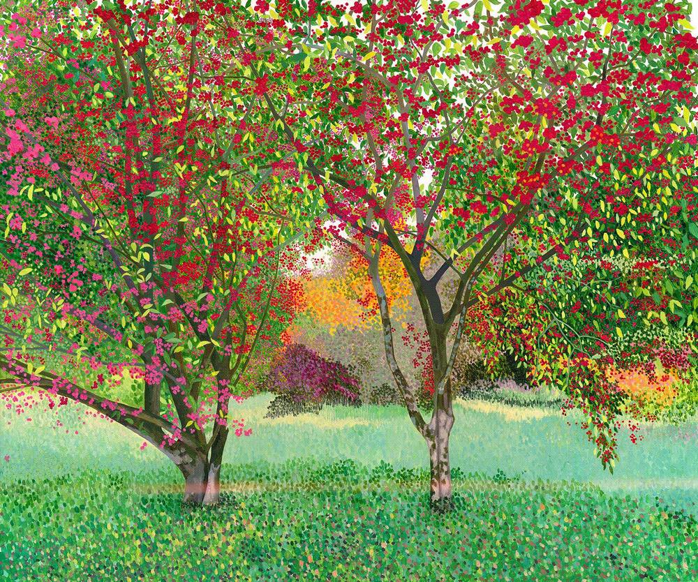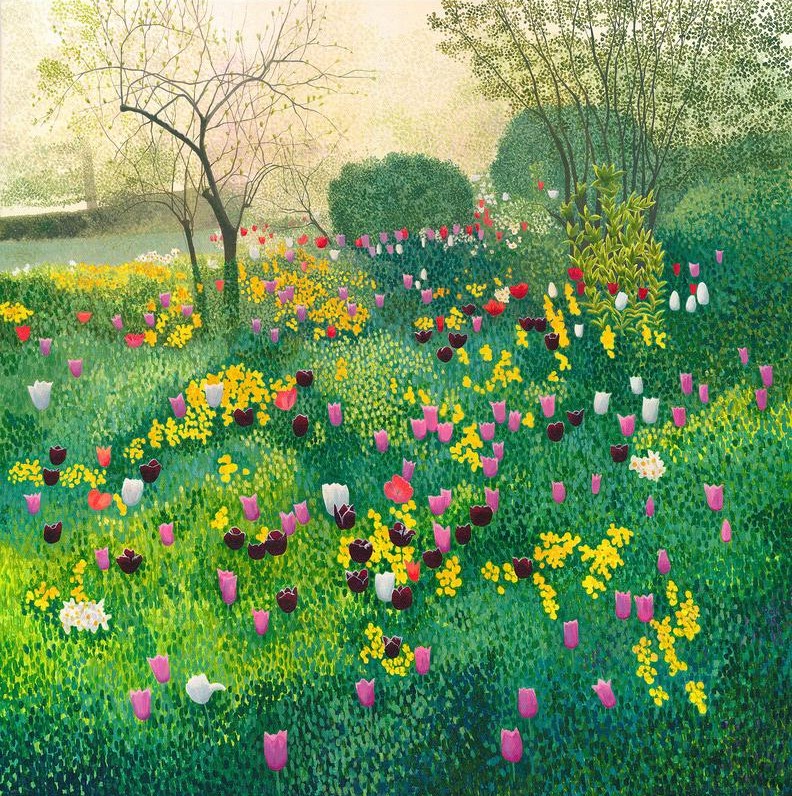 Otras pinturas nos llevaran a disfrutar el amanecer de un jardín de verano. Los tulipanes de Forde Abbey en Somerset, también están representados, como lo están los tonos rojizos de las hojas de los evónimos en otoño (Euonymus europaea) en esos mismos jardines.