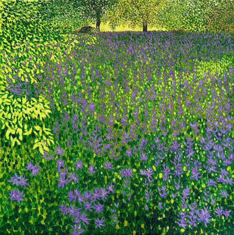 Dice que su interés es llevar parte de la naturaleza y el jardín a la casa de alguien, en forma de tarjetas, cuadros, murales y objetos decorativos. Algo así haré hoy con sus pinturas, que nos llevarán a diferentes jardines y paisajes, inundando nuestro entorno de color y sensaciones.
