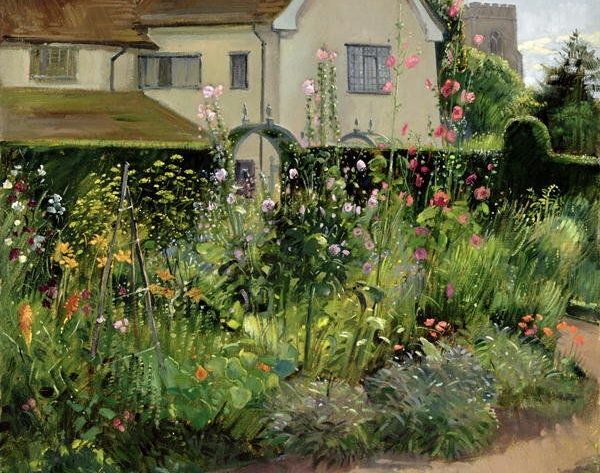 A mediados de la década de 1980, las obras de renovación de su nueva casa y jardín en Bedfield Hall, cerca de Framlingham en el condado de Suffolk, le inspiraron para volver a la pintura. A partir de entonces se fue labrando una reputación como pintor de jardín y paisaje. Veremos pinturas suyas con algunas conocidas casas inglesas, como Great Dixter. Pero hoy quería mostrar las que se refieren a su propia casa en Bedfield. Un jardín al que tendremos que volver con fotos, cuando las encuentre, pero que podemos imaginar a partir de algunas de sus pinturas. Ahí están sus plantas, alineaciones y estructuras. Su jardín de hierbas. Sus macetas. Gran devoción por los lirios y muchos, muchos ratos junto a la ventana.