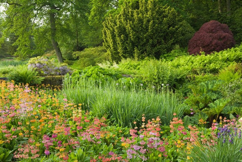 Hostas, helechos, junto a colores vivos de prímulas se refugian bajo los árboles. Es la zona dedicada a las plantas de sombra.