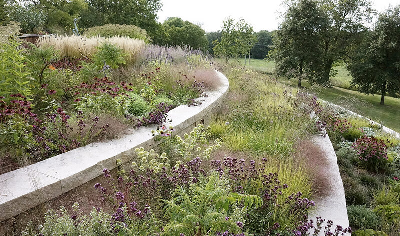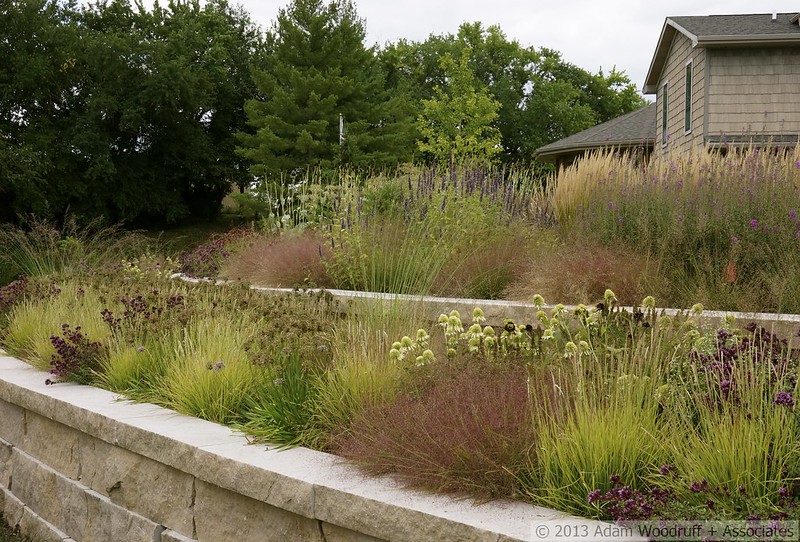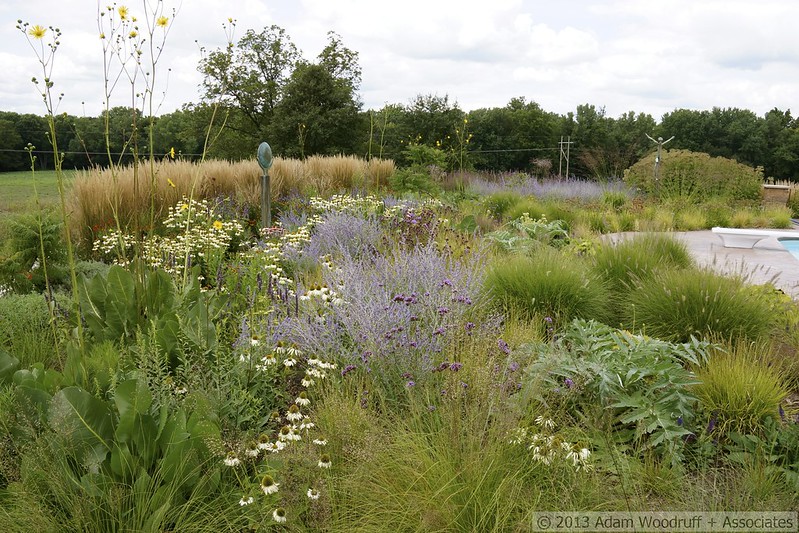 Una parcela de 20.000 metros cuadrados cuyo jardín envuelve ahora -las fotos son del 14 de Agosto de 2013– la casa con perennes y plantas autóctonas, en una zona rural de Illinois. Al estar situada en una colina, hubo que hacer una importante nivelación que permitiera crear áreas de siembra a nivel de la casa y poder construir la piscina. La belleza indiscutible. Las fotos, considero que hablan por sí solas.