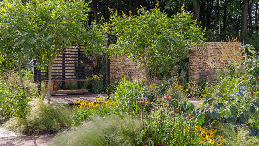 Tienen un especial protagonismo los árboles de varios tallos y un banco protegido por la sombra moteada de una pérgola, que tiene vistas al movimiento suave de las gramíneas ornamentales, y la textura y toques de color de flores amarillas, rosadas y moradas de plantas como helenios y equináceas.