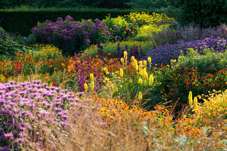 Bordura con Dahlia, Helenium, Kniphofia, Asters y Lobelias en RHS Garden Rosemoor, Devon • RHS/Mark Bolton
