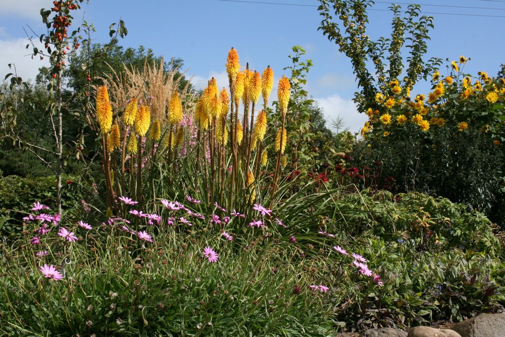 No obstante, es bueno saber que existen especies botánicas que son en sí mismas aptas para jardín. Tal es el caso de Knipophia rooperi, que en otoño produce cabezas de flores rojas/amarillas ampliamente globosas.