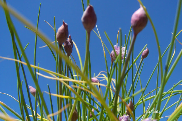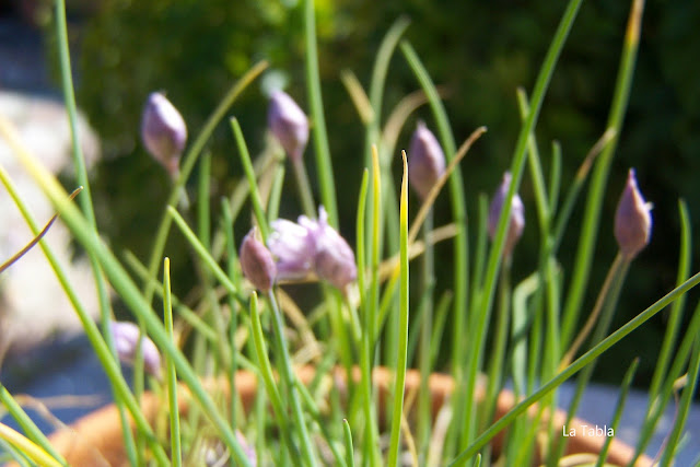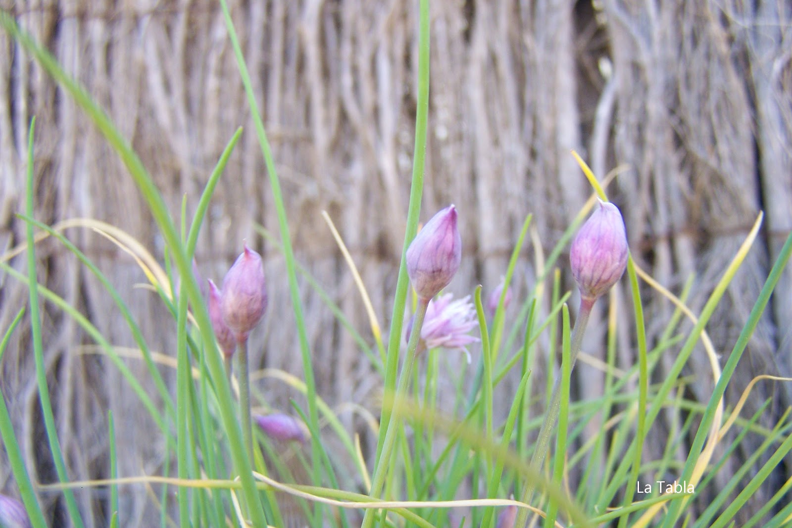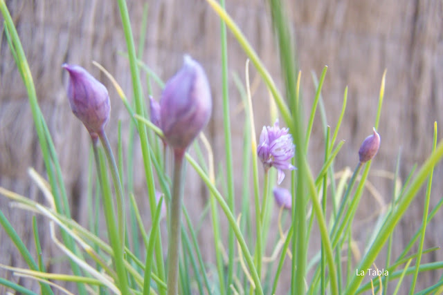 Están en macetas de barro, cerca, muy cerca de la cocina: Allium schoenoprasum, cebollino, cebolleta, cebollín, cebolla de verdeo, cebolla china, ajo pardo, ajo morisco, ajo de españa, ajo moruno … y en francés ciboulette. ¡Será por nombres! Flor bella y ¡hojas deliciosas en la ensalada! Acuérdate de secarlas bien despues de pasarlas por agua. Así quedan más sueltecitas en la ensalada y ¡lucen más!