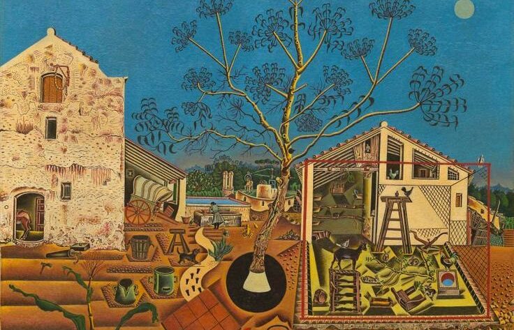 La pintura de Joan Miró (Barcelona 1893 – Palma de Mallorca 1983), uno de los mayores exponentes del surrealismo, es claramente lúdica, un juego. No quiere seriedad sino libertad en su espacio natural. Y ahí está La Masía, una pintura en oleo sobre lienzo realizada cuanto tenía 29 años; mágica, absolutamente cautivadora. La luz, la tierra, los animales, el eucalipto casi hasta el infinito, la escalera como una huida, las grietas; la regadera y la prensa; los animales; la vida en el campo.