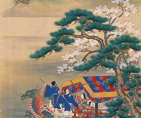 En esta obra -catalogada entre 1828-1853- del artista japonés Sumiyoshi Hirosada nos muestran una embarcación de recreo, cuyo toldo está primaveralmente adornado también, que pasa, transportando  a un grupo de mujeres de la corte, por debajo de los cerezos y en el fondo se puede ver también un sauce (Salix) que brota y las flores amarillas de Kerria, posiblemente japonica, junto a la orilla del río.