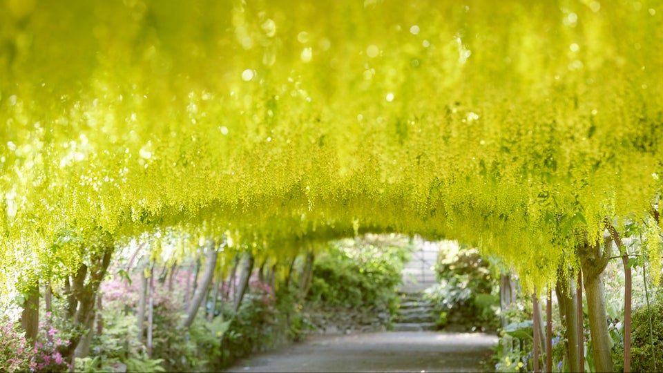 Entre los aspectos más destacados de la primavera en Bodnant Garden, uno de los jardines británicos más valorado por sus colecciones botánicas, se encuentra la floración del Laburnum Arch a finales de mayo y principios de junio. Esa pérgola, de 55 metros de largo, se cubre de largos racimos colgantes de flores amarillas, dando forma al túnel de flores de laburno más antiguo y largo del Reino Unido.