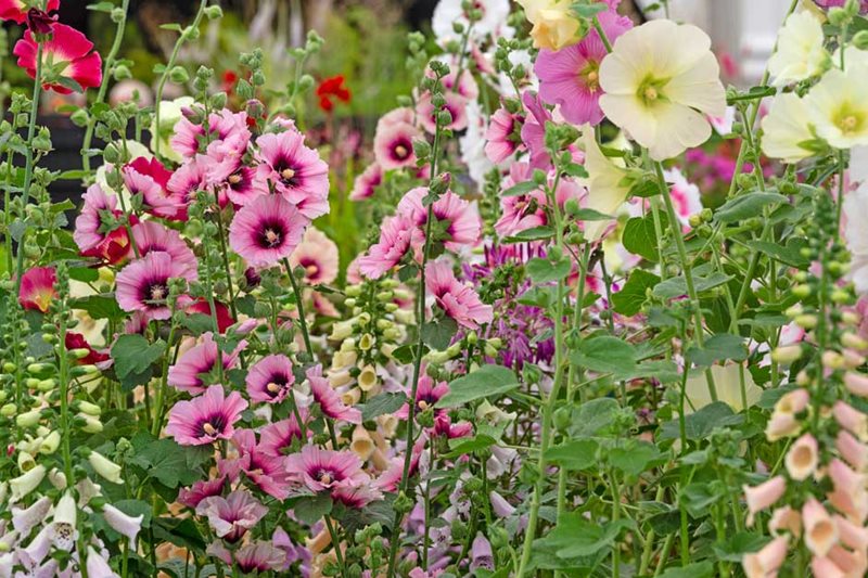 Las diversas selecciones de preciosas malvarrosas (malva real) en tonos pastel (entre ellas Alcea rosea ‘Halo Apricot’; Alcea rosea ‘Halo Cream’; Alcea rosea ‘Halo Candy’ y Alcea kurdica ‘Sunshine’) se presentan combinadas con dedaleras (Digitalis ‘Dalmatian Peach’) y cleomes (Cleome ‘Violet Queen’).